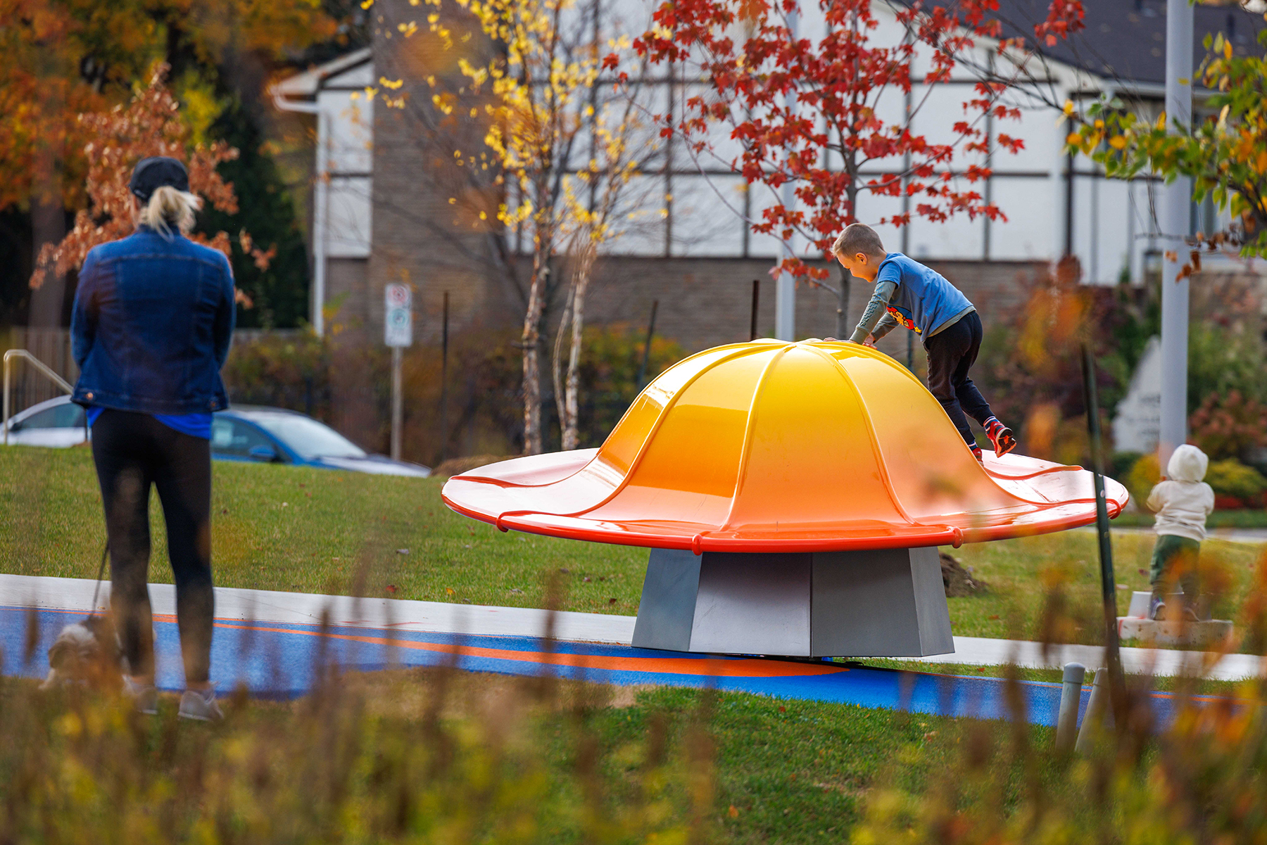‘Fungi of the Woods’ is an artwork that is accessible physically, sonically, and tactilely. The ground plane, seating, and tabletop surfaces are barrier-free. The concrete and rubberized surfacing has clearances for wheelchairs. In terms of sensory activations, the tall sculptural mushroom stem will have raised dimple-like forms that people can run their hands upon, and the hollow metal forms will ring upon tapping. People of varying abilities will be able to engage with the artwork independently and with dignity.